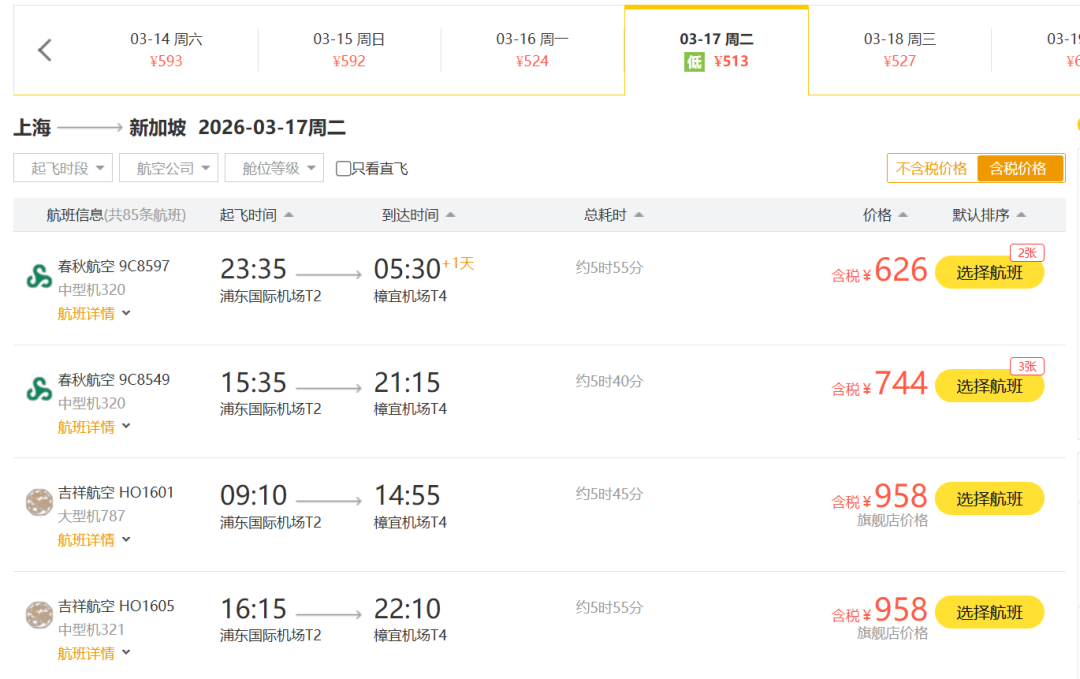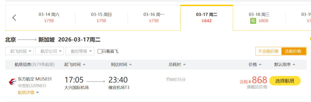 北京飞新加坡马航转机的价格600多块,但如果选择东航直飞,价格含税还不到900块。有的朋友可能会担心11:40落地新加坡,时间是不会相对较晚。