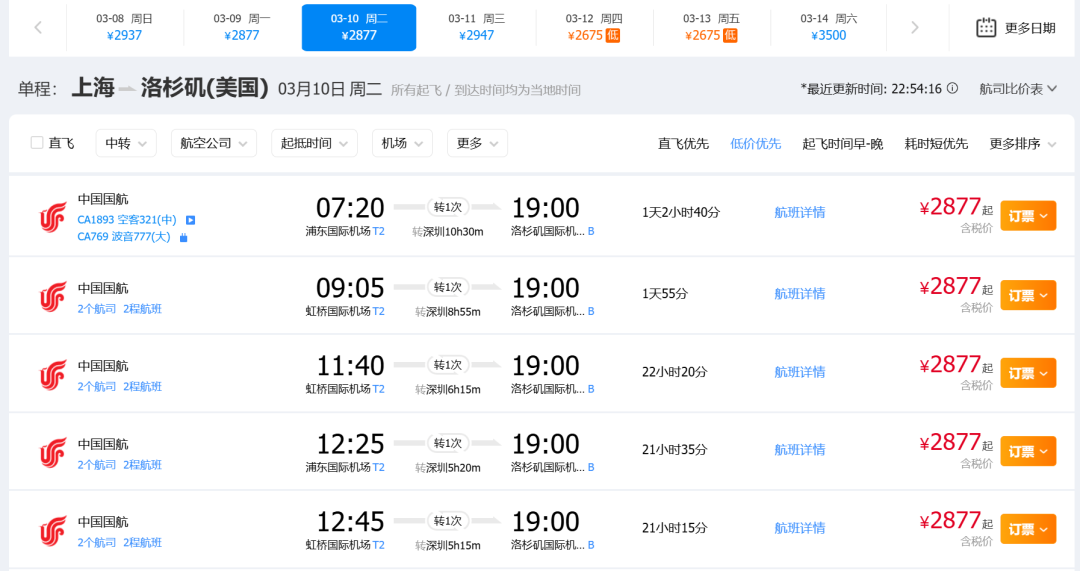 大家可能不知道这个价格有多离谱,同日期上海飞洛杉矶的机票,国航转机含税2877元,美联航直飞的价格也才3000多!