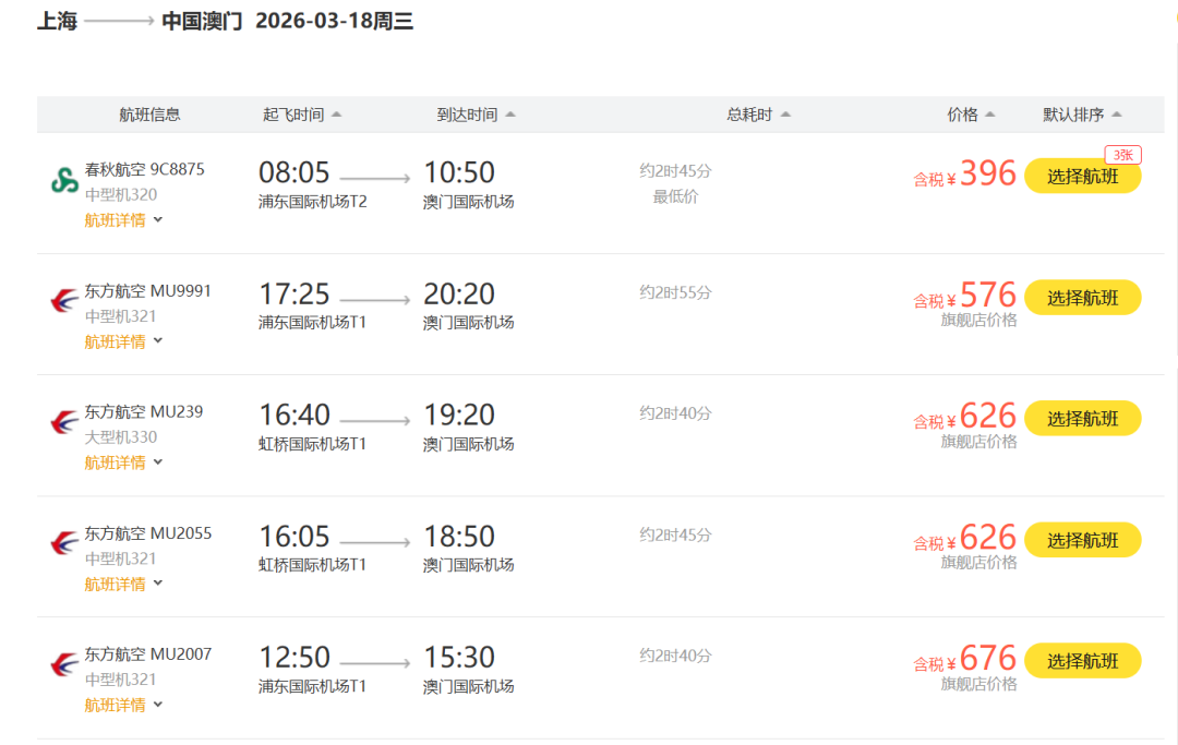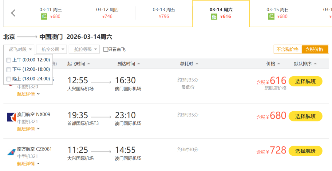 北京飞澳门南航和澳门航空和东航价格都只在六七百块。各位要知道,如果搭乘火车去澳门,即使是坐高铁二等座过去都比这个机票贵。