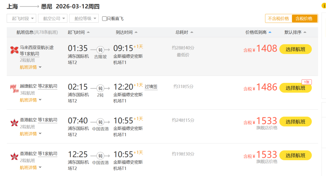 要说去远点的地方,上海飞悉尼,含税价才1400-1500,香港航空的更划算一些。虽然需要在香港转机,但带行李的价格才1533元!