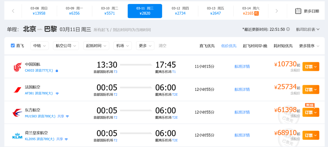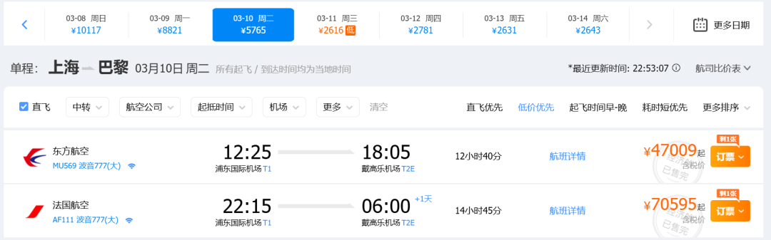 东航的价格更猛,上海去巴黎的经济舱多日售罄!公务舱都剩不了几个机位了!